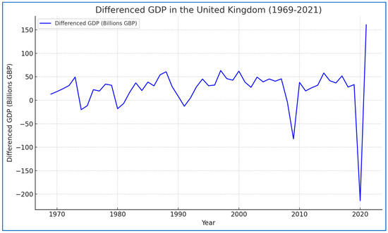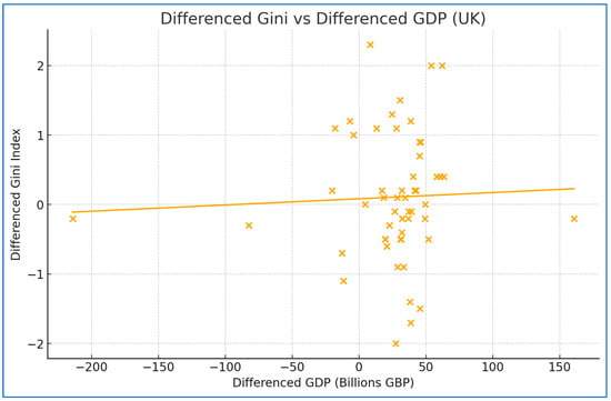 The stationarity tests conducted for the United Kingdom, as shown in Table 1, reveal important findings regarding the behavior of the GDP and Gini series. For the UK’s GDP, the Augmented Dickey–Fuller (ADF) test fails to reject the hypothesis of non-stationarity, indicating that the GDP series does not exhibit stationarity. Additionally, the Kwiatkowski–Phillips–Schmidt–Shin (KPSS) test rejects the null hypothesis of stationarity, further supporting the conclusion that the GDP series is non-stationary.