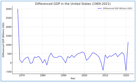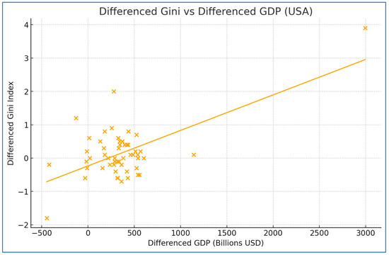 The stationarity tests for the United States, as presented in Table 2, provide key insights into the behavior of the GDP and Gini series. For the USA’s GDP series, the Augmented Dickey–Fuller (ADF) test does not reject the hypothesis of non-stationarity, indicating that the series is not stationary. Similarly, the Kwiatkowski–Phillips–Schmidt–Shin (KPSS) test rejects the hypothesis of stationarity, reinforcing the conclusion that the GDP series lacks stationarity.