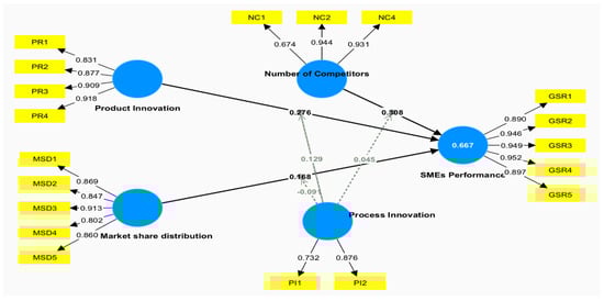 A three-stage measurement model that included factor loadings, convergent validity, and discriminant validity was used to evaluate the relationship between latent variables. The degree to which the observable variables and underlying factors are related is measured by factor loadings. To ensure the goodness of the model fit, the factor loadings were carefully examined or loaded to their respective areas. According to Hair et al. (2014), every loading satisfied the minimal cut-off of 0.5. Next, convergent validity was assessed using the average variance extracted (AVE), and internal consistency and convergent reliability were computed using metrics like Cronbach’s alpha and composite reliability (CR) (Hair et al. 2019). Every model construct demonstrated strong convergent validity (see Table 1) and met the recommended threshold for Cronbach’s alpha (≥0.7), indicating adequate internal consistency. AVE calculates the difference between the variance a construct captures and the variance caused by measurement error. When the AVE is 0.5 or greater, indicating that the construct accounts for more than half of the variation in its indicators, this is generally regarded as acceptable. This is essential to proving the validity of the construct. It is significant to highlight that items like product innovation (PR5), number of competitors (NC3, NC5), and process innovation (PI3, PI4, and PI5) were deleted since the thresholds did not meet the normal requirement of 0.5.