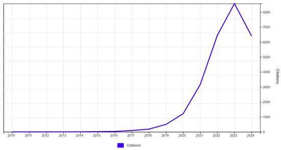 Regarding the number of citations (see Figure 3), it is evident that as the number of publications increases, so does the citation count, reflecting an intensifying concern for these domains. In 2022, the highest number of citations was recorded, exceeding 8000, indicating that publications from this period had a significant impact and were widely referenced. In the last two years covered by the analysis, although the number of citations slightly decreased in 2023 and more noticeably in 2024, it remains high compared to the period before 2018. This trend suggests increased academic recognition and growing relevance of research on the interaction between financial development and climate change.