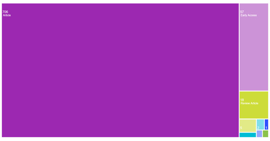 The selected set of publications is diverse, encompassing a variety of formats and types of works in the field of financial development and climate change. However, according to Figure 4, the predominant category is scientific articles, representing 96.7% of the publications in this field (706). This suggests that the majority of research on this topic is presented in the form of original research articles. Another significant category is early access articles, totaling 57 works (7.8%), indicating an interest in the rapid publication of new and relevant research in the investigation of the relationship between financial development and climate change. Review articles (18) also represent an important part of the literature, aiming to synthesize and analyze existing studies, providing a comprehensive perspective on the current state of knowledge in this field. There are also other categories of publications, but these are much less represented. These include the following: