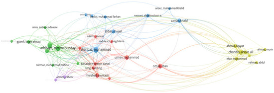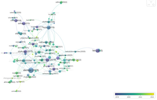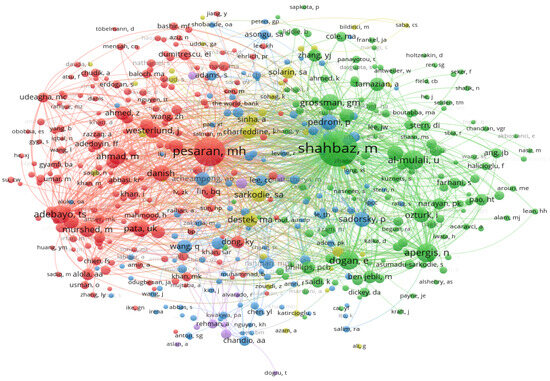 These authors have been grouped into five distinct clusters, identified by the colors red, green, blue, yellow, and purple. The first cluster (red) includes 178 authors, with the most cited being Pesaran, M. (97 citations); Davis, F.D. (754 citations); Adebayo, T. (296 citations); and Ahmad, M. (246 citations). The second cluster (green) comprises 143 authors, with Shahbaz, M. (1162 citations) and Al-Mulali, U. (353 citations) being the most representative. The blue and yellow clusters have 106 and 33 authors, respectively, with the most influential being Pedroni, P. (226 citations) and Sadorsky, P. (210 citations) for the blue cluster, along with Destek, M. (184 citations) and Sarkodie, S. (181 citations) for the yellow cluster. The final cluster (purple) includes 10 authors, among whom Paramati, S. (98 citations) is the most cited, ranking among the top 30 cited authors in this field.