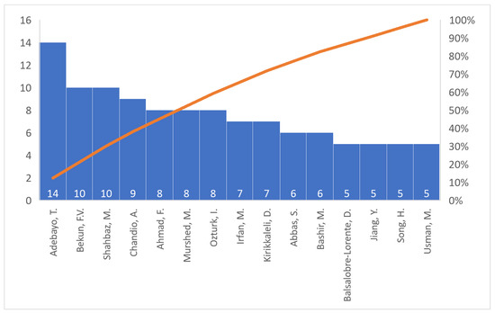 Thus, the most articles (164) were published in the journal Environmental Science and Pollution Research, which had an impact factor of 5.8 in 2022. This is followed by three other journals, each publishing 30 articles on the topic over the years. The first among them is Renewable Energy, with an impact factor of 8.7 in 2022. The other two are Journal of Cleaner Production, with an impact factor of 11.1, and Environment, Development and Sustainability, with an impact factor of 5.6. Another journal with a significant number of papers is Energies, which had an impact factor of 3.2 in 2022 and published 29 articles. The journals Sustainability and Resources Policy each published 27 articles, with impact factors of 3.9 and 10.2, respectively. The journal rankings are followed by Frontiers in Environmental Science with 22 publications and an impact factor of 3.3 in 2022, and Journal of Environmental Management with an impact factor of 8.0 and 20 publications on this subject over time. Other journals (Natural Resources Forum, Energy Economics, International Journal of Environment, etc.) have published fewer than 20 articles.