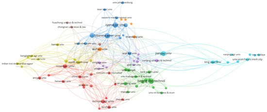 In conclusion, the analysis highlights that institutions from China and Turkey are leaders in publishing articles on the relationship between financial development and climate change, due to some key factors. These countries allocate significant funds for research and development, focusing on innovation and eco-friendly technologies. Both countries are committed to supporting the Sustainable Development Goals (SDGs), promoting investments in green solutions. Additionally, environmental challenges, such as pollution in China and Turkey’s vulnerability to climate change, necessitate investments in adaptation and mitigation solutions. However, institutions from other countries have also contributed to clarifying this relationship (see Figure 10), emphasizing the significance of these countries in researching this field. Regarding international collaboration, top institutions are observed to collaborate extensively with universities from different countries. This diversity of international collaborations reflects a global research network that enhances and deepens knowledge in the fields of financial development and climate change. These transnational partnerships not only increase the visibility and impact of studies but also stimulate scientific innovation and progress through the exchange of ideas and resources among participating institutions.