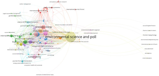 Consequently, this analysis will address the fifth research question: “Which journals publish the most articles on the investigated relationship?” A total of 730 papers were published in 172 scientific journals. Figure 11 illustrates the total number of journals, with the minimum threshold of articles published in a journal being one. The number of publications varies, and based on the map, we can rank the journals where articles on the relationship between financial development and climate change have been published.