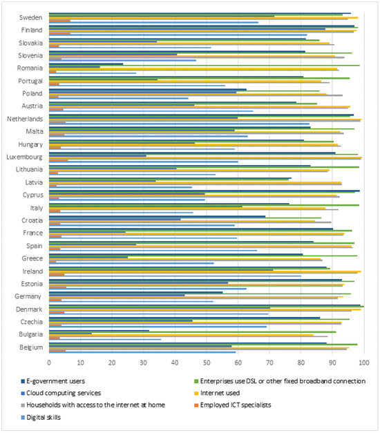 - Stavytskyy, Andriy, Ganna Kharlamova, and Eduard A. Stoica. 2019. The analysis of the digital economy and society index in the EU. TalTech Journal of European Studies 9: 245–61. [Google Scholar] [CrossRef]
