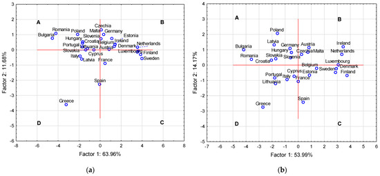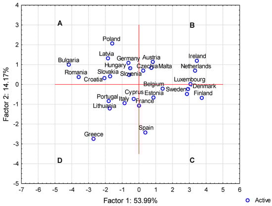 The position of the EU countries from the point of view of the selected digital indices, GDP and unemployment rate, is shown in Figure 2. This portfolio is one of the possible graphical outputs of the PCA method, which allows a large number of indicators to be replaced with several factors. Factor 1 and factor 2 in the portfolio define a window into the K-dimensional variable space. By projecting all the observations onto the low-dimensional sub-space and plotting the results, they allow us to visualize the structure of the analyzed data set. Factor 1 is highly correlated with the indicators digital skills, employed ICT specialists, households with access to the internet at home, Internet use, cloud computing services, e-Government users and GDP per capita. Factor 2 is correlated with the indicators of enterprises using DSL or other fixed broadband connections and total unemployment rate. The portfolio consists of four quadrants. In quadrant A, the countries that report problems in the field of fulfilling criteria laid down by individual digital indices, as well as in “GDP” and “Unemployment rate”, are shown. The best countries in the given field are located in quadrant B. This group includes countries like Ireland, Austria, Netherlands, Czechia and Malta. The Nordic countries Sweden, Finland and Denmark are very close to the border limits. Some of these countries show minor shortcomings in the fields “Individuals’ level of digital skills”, “Enterprises use DSL and other fixed broadband connection” and “Unemployment rate”. Quadrant D includes the countries that are in the worst position from the point of view of not only all digital transformation indices, but also “GDP” and “Unemployment rate”. These include Greece, Italy, Portugal and Cyprus.