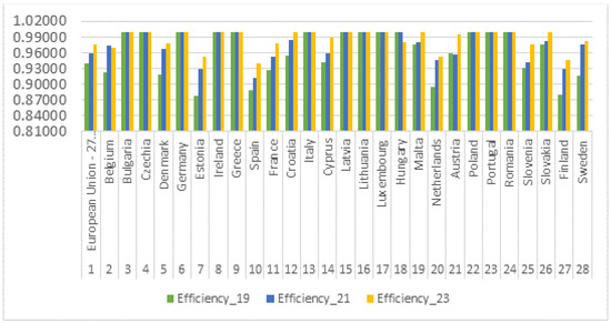 To assess the efficiency over time, the Malmquist index for the periods 2019–2021 and 2021–2023 was applied. The results of the MI for the period 2019–2021 are presented in Table 3. Technical efficiency at the required level 1 has been achieved in almost every EU country. In our opinion, this was caused by a shift in the efficiency frontier, as a result of the technological changes that occurred in individual countries over the years. Since this is a comparison of the years 2019 and 2021, it can be assumed that these significant technological changes also occurred due to the impact of the COVID-19 pandemic. The change in the efficiency of the use of already established digitalization elements was equal to 1 only in some countries (see Table 3). When comparing the years 2019 and 2021, these countries used previously established digitalization elements very effectively (Bulgaria, Ireland, Spain, Latvia, Lithuania, Luxembourg, Hungary, Austria, Portugal, Romania).