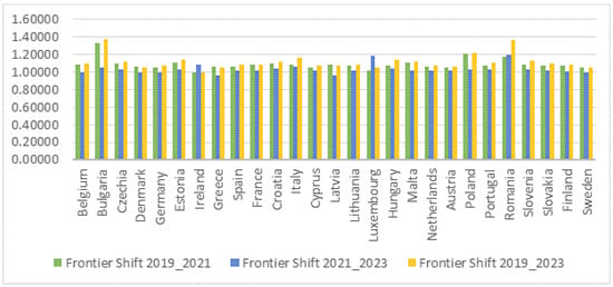 The most significant changes in frontier shifts occurred when comparing the years 2019 and 2023. The largest technological changes were implemented in Bulgaria, Italy, Hungary, Poland and Romania (see Figure 6).