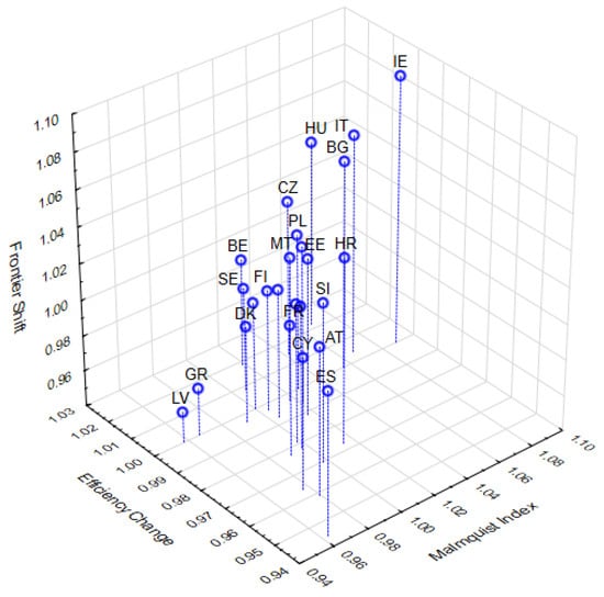 Three-dimensional scatterplot of Malmquist index against efficiency change and frontier shift. Source: processed by authors in Statistica 14.1.0.8 software.