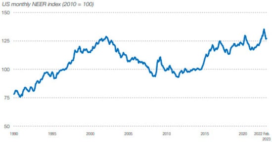 The South African Reserve Bank adopted the floating exchange rate regime as one of the macroeconomic policies, with the objectives of safeguarding the rand against globalisation speculators, containing social unrest, especially by the labour unions and strike actions, and avoiding a debt crisis arising from escalating public sector debts. Besides acting as insurance against adverse effects from more volatile, unpredictable weather that may dampen agricultural exports and thus the worth of the rand to the US dollar, according to Moyo and Tursoy (2020), the exchange rate is viewed as the price which the currency of one country will cost concerning the other country or a certain economy area. Another example is what number of South African rands (ZAR) does it take? For example, one US dollar? Regarding Sanusi et al. (2023) on the subject, the exchange rate can be interpreted as the degree of equivalence of one country’s currency to another. It is called fixed in systems where each currency has a unique metal or standard value, such as those that use negotiated standards or precious metals. South Africa’s currency has been vulnerable to capital movement booms and busts since it is a developing country with a well-established and liquid foreign exchange market. According to the Hassan (2013) his is shown by the rand’s regular but brief decline versus the US dollar. The main foreign currency used in this study is the US dollar, a significant global medium of trade and a global reserve currency. As highlighted in Figure 1 below, there are fluctuations in the nominal effective exchange rate of the US dollar.