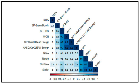 Figure 1 shows the pairwise correlation between the green assets. A high and positive correlation exists between S&P ESG and WCN and between S&P Global Clean Energy and Nasdaq Clean Edge Green Energy, depicting the perfect alignment of their price movements. The green cryptocurrency generally presents low and positive or zero correlation, as it is between Nano and Ripple (0.2) and IOTA and Green Bonds (0.1). However, Steller shows a high positive correlation with Ripple and Cordano.