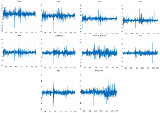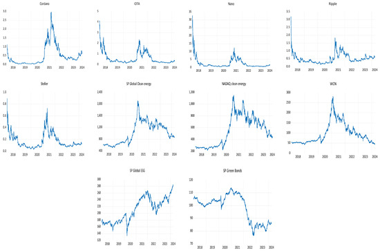 This paper unravels the interconnectedness and spillover effect of the major green assets present in the market, including green cryptocurrencies, green energy, and green bonds. Five proxies of green cryptocurrencies are used: Cardano, Ripple, Iota, Stellar, and Nano. Three clean energy proxies include S&P Global Clean Energy, WilderHill Clean Energy, and the NASDAQ Clean Edge Green Energy Index. The proxy of green bonds is the S&P Green Bond Index, and for sustainability, the S&P Global ESG Index is included. Daily closing prices of all cryptocurrencies are taken from the https://www.investing.com/ database (accessed on 27 March 2024). Other variables data are collected from the data stream. The sample period is 3 January 2018 to 27 March 2024. For the calculation of returns, this study considered the log returns as they are more stochastic in nature and follow the zero mean and constant variance more closely than the closing price data. All market data is in US dollars: