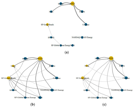 Figure 4b,c represent the extreme market conditions at the 5th and 95th quantiles. The presence of a strong connection in the green asset market can be seen in the network plot under extreme market conditions. The direction of the spillover is almost the same under both market conditions; however, the spillover effect, represented by the thickness of the lines, appears to be stronger in the low market conditions (5th quantile) in comparison to the high market state (95th quantile). S&P Green bonds and IOTA are the major receivers of shocks in the system, and these results align with the findings of Khalfaoui et al. (2022). Tiwari et al. (2022) also reported that green bonds are the primary receivers of shocks in the system. S&P Clean Energy, WCN, Nasdaq Clean Edge Green Energy, and S&P ESG are spillover transmitters in extreme conditions. This study supports the findings of Umar et al. (2022) and Zhou and Wang (2024) that cryptocurrency exhibit time-varying connectedness and are highly sensitive to market deviations.
