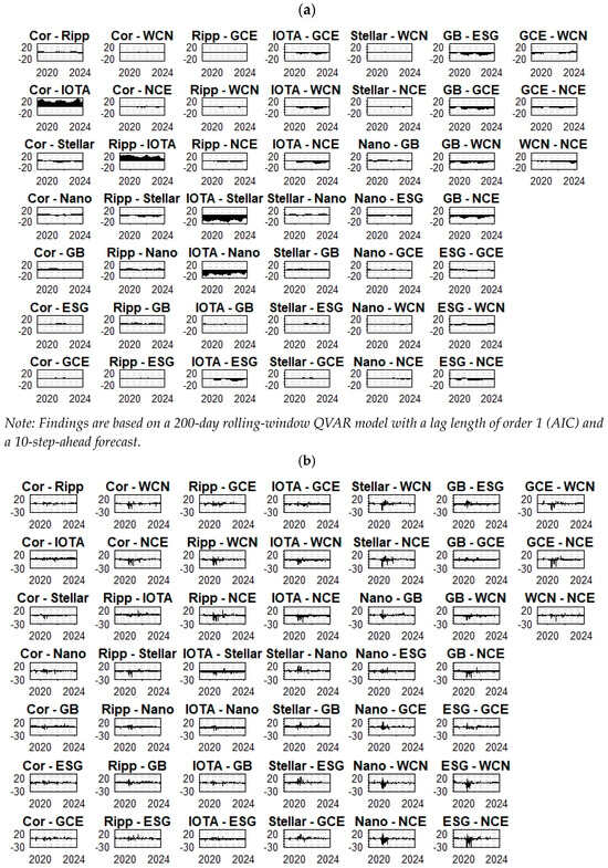 S&P Green Bonds (34.7%) receive the least shocks from others, and the rest of all the assets receive more than 57% shocks from others. IOTA (−71.32%) and S&P Green bonds (−21.41) are the net receivers, and all other green cryptocurrencies and green assets are net transmitters. The Total Connectedness Index (TCI) value is 63.39%, which indicates a strong average connectedness in the system.
