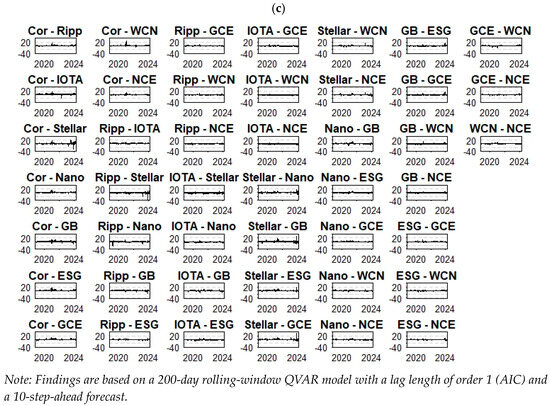 These peaks possibly correspond to the global events in early 2020, such as COVID-19 and, in early 2022, the Russia–Ukraine war, where markets seem to become more synchronized and lead to higher connectedness. Total connectedness remains high in lower and extreme market situations, showing a strong and persistent relationship among the green assets. These findings are consistent with Tiwari et al. (2024), who also found that total connectedness among green energy stocks and Bitcoin was higher under extreme market conditions, and connectedness was lower under moderate market conditions. A time-varying connectedness is observed in the results, and these findings are in line with the conclusions of Tiwari et al. (2022) and Mensi et al. (2021). Based on the findings of this study, portfolio investors are suggested to vigilantly observe their portfolios consisting of green assets, especially under extreme market conditions.