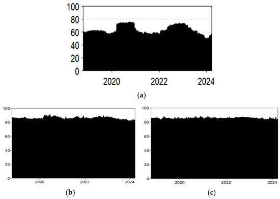 The study also reports the time-varying dynamic analysis of the spillover over the sample period. The results of total connectedness analyses are presented in Figure 6a–c at three quantile levels. Under normal conditions depicted in Figure 6a the total connectedness varies over the sample period, with values ranging from 45% to 70%, showing a stable network with consistent baseline connectivity and periodic fluctuations in the overall connectivity. The most prominent peaks are in 2020–2021 and later in 2022–2023, confirming the periods where connectivity is stronger, which can be associated with the COVID-19 pandemic and Russia–Ukraine war conflict in February 2022.