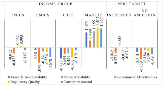 From the NDC target perspective, both countries that increased NDC targets and those that did not had negative values for all the indicators, except government effectiveness (0.005) for countries that increased their targets. This suggests that government effectiveness is a key driver for climate finance received.