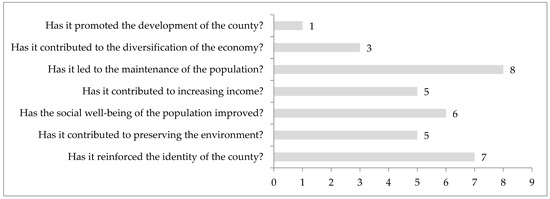 The results of the interviews show that the three areas in which the implementation of the program is most highly rated are its contributions to the development of the county, to strengthening the identity of the territory and to the diversification of its economy. Starting with the latter, this may be logical given that the interviewees are tourism promoters; they are therefore one of the best examples of the program’s contribution to the diversification of the economy. In the interviews, the order of the questions is the same as that given in Figure 2 and Figure 3; this was intended to go from the general to the most specific. Therefore, the local actors’ assessment of the program’s contribution to county development could be considered as the closest thing to an overall assessment of its implementation.