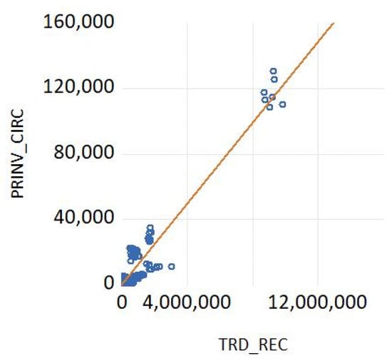The strongest link is between private investments, jobs, and the gross value added in relation to circular economy sectors (PRINV_CIRC) and trade in recyclables (TRD_REC), which is presented in Figure 1.