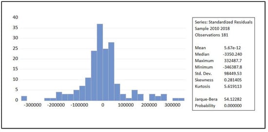 The trade volumes in recyclables are researched following a two-stage methodology. Following the first step, the authors must prove that the suggested equation is possible and matches statistical validity. The formula of the dynamic regression model is presented herein (see Equation (2)), where information from Table 5 is used. The authors included the coefficients of the formula and standard error values:
