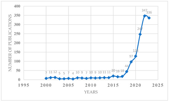 Figure 2 shows the annual distribution of 1404 papers that were published on the subject of economic development and the digital economy from 2000 to December 2023. During this period, there was a remarkable yearly growth rate of 30.78%. While the study of this subject began in the early 2000s, the number of published works was very small until 2017. Prior to 2017, the prevalence of this literature topic was not significant. However, it did not include the term “digital economy” in its title, abstract, or keywords. Nevertheless, there has been a notable upswing in scholarly attention since 2019, demonstrating the growing significance and acknowledgment of this discipline. The observed increase is significantly different from what is typically seen in traditional economics. A search for relevant publications using specific keywords and titles in the Web of Sciences Database Core Collection resulted in over 5400 pages, indicating that research in economic development and the digital economy is still in its early stages.