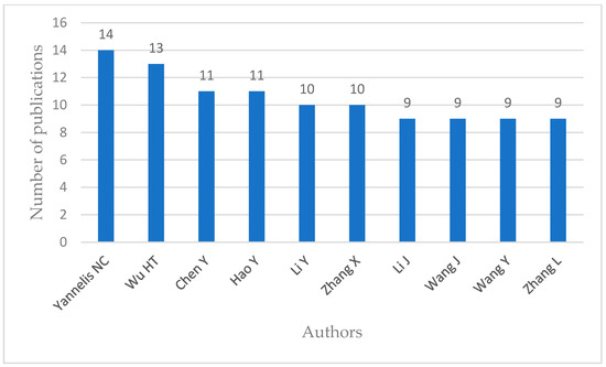 Figure 3 delves into the most prolific authors within the fields of economic development and digital economy. Yannelis N.C. leads the pack with an impressive 14 publications, followed closely by Wu H.T. with 13 contributions. Interestingly, both of these authors currently reside in China, highlighting the country’s growing prominence in this field. Chen Y, Hao Y, and Li Y each boast a respectable 11, 11, and 10 publications, respectively. This analysis provides valuable insights into the individuals who have significantly shaped the discourse on economic development and the digital economy through their prolific research output.