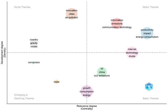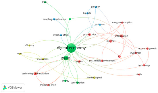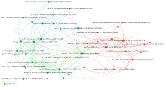 Figure 7 underscores the substantial influence of the journal Sustainability in the research landscape of economic development and the digital economy, highlighting its strong connections with a diverse range of academic journals in this field. This analysis provided valuable insights into the major publication outlets and thematic relationships within the field, allowing researchers to identify relevant sources and explore potential collaborations.