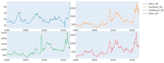 The data employed span the period from January 1990 to October 2023 and cover a range of normal periods and crises. Data represent the global prices (in US dollars per metric ton) of olive oil, soybean oil, sunflower oil, and palm oil. They are downloaded from the International Monetary Fund (IMF) database. They are expressed in monthly frequencies and transformed into logarithmic differences for the purposes of estimations.