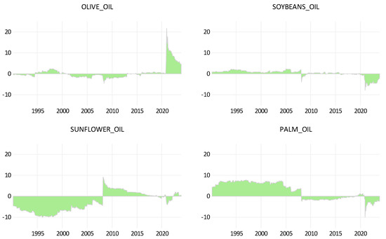 Moreover, as concerns sunflower oil, it is illustrated that it displays significantly higher joint connectedness toward the remaining types of oil than olive oil does. Furthermore, its joint effect is smaller in relation to the cases of soybean oil and palm oil. While the joint nexus starts from a somewhat lower level than 30%, it reaches almost a 45% level from 2000 to 2005. It should be underlined that this keeps falling until the launch of the Global Financial Crisis—when it falls below 20%—and remains stable until unconventional monetary practices commence, as well as the US QE-tapering era. It should be mentioned, though, that significant upside tendencies were brought about during the two latest crises. To be more precise, these linkages toward the system increased during the pandemic and reached a peak during the Russia–Ukraine war, displaying a level slightly lower than 40%. This is approximately 10% lower compared with the cases of soybean oil and palm oil.