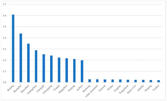 Based on the comprehensive evaluation results mentioned above, this study further calculates the average scores of the digital construction level for each city in China from 2011 to 2021. Figure 1 presents the top ten and bottom ten cities based on the average scores.