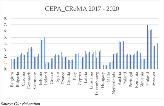 Another indicator that reveals the European situation is the CEPA_CReMA, encompassing all products, expenses, and activities carried out for environmental protection. They, as defined by Eurostat (2020), are not only all economic activities aimed at preventing, reducing, and eliminating any form of pollution or environmental deterioration but also all the activities dedicated to restoring already compromised situations. Figure 3 shows that the European countries most committed to pollution prevention and everything that can make the entire system more sustainable are Finland, Estonia, Austria, and Sweden.