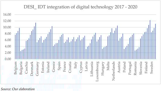 Figure 4 represents the evolution of the level of the integration of digital technology in European businesses from 2017 to 2020. It is evident that digitalization is more developed in the northern European countries, but the positive aspect is the growing trend the index assumed in the timeframe.