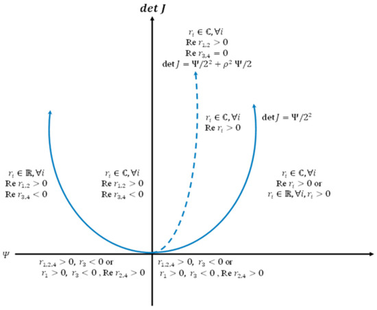 Classification of the eigenvalues depending on det J and Ψ.