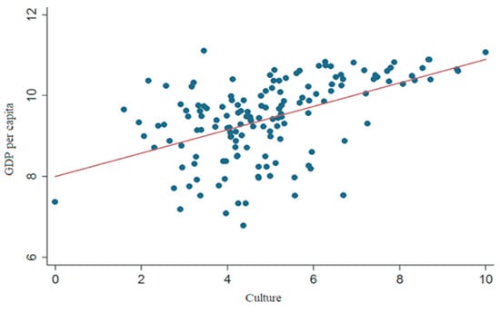 This study’s methodology involves a multifaceted estimation equation (Equation (1)) to analyze the relationships between cultural and institutional backgrounds and GDP per capita. This equation is pivotal in determining (a) the individual effects of cultural and institutional backgrounds on GDP per capita, (b) the combined impact of these variables, (c) the influence of the product of these two variables, and (d) the effect of their quotient on GDP per capita. The product of cultural and institutional variables is particularly significant, indicating their complementarity. A higher product between culture and institutions indicates strong complementarity; a lower product suggests weaker complementarity. Intermediate product values point to either strong institutions with weak culture or vice versa. Analyzing the culture-to-institutions quotient provides deeper insight into their combined effect on GDP, moving beyond simple additive models to explore how their interaction influences economic paths. A higher quotient may signal greater cultural impact on economic outcomes, while a lower quotient indicates stronger institutional influence. This inclusion aims to reveal the joint effects of culture and institutions on economic growth, challenging the idea of their independent or additive roles and highlighting the importance of their interaction.