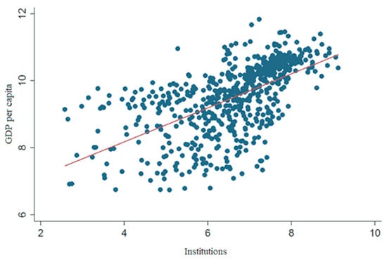 Scatterplot showing the relationship between GDP per capita and institutional background.