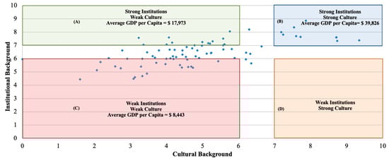 Kafka et al. (2020) further delve into the interplay between cultural and institutional backgrounds and their impact on GDP per capita. They employ a scatter plot divided into four quadrants to categorize countries based on their cultural and institutional strengths. Quadrant A includes countries with strong institutional but weak cultural backgrounds, B encompasses countries strong in both aspects, C represents countries weak in both, and D includes those with strong cultural but weak institutional backgrounds. This study calculates the average values for each country’s cultural background, institutional background, and GDP per capita over the entire analysis period. Following Williamson’s (2009) methodology, countries are classified as having a strong cultural or institutional background if they score above seven and as weak if they score below five. The current analysis, drawing upon the theoretical framework established by Kafka et al. (2020), investigates the relationship between cultural and institutional backgrounds and their impact on GDP per capita.