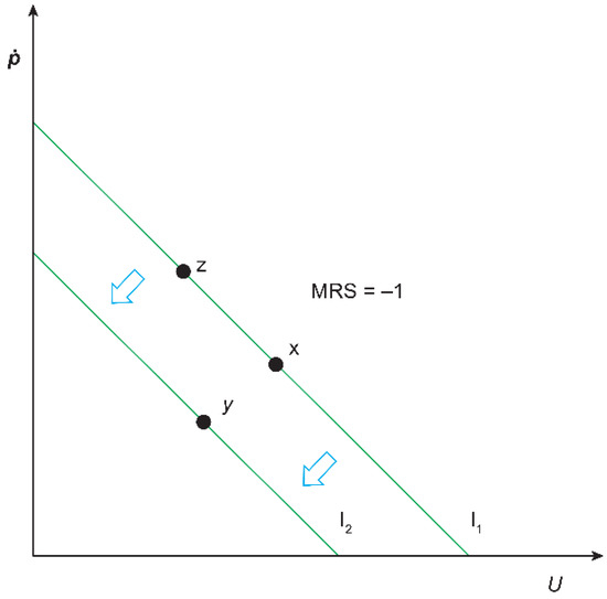 Given that Okun’s MI only takes two macroeconomic indicators into account, Lovell and Tien (2000) consider that it can be interpreted as a “crude (dis)utility function”, in which indifference curves are straight lines with a marginal rate of substitution, (), equal to −1. This implies that individuals feel exactly the same aversion to both unemployment and inflation, as per Varian (1999), assuming that corresponds to the simplest case of perfect substitutes.