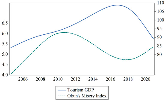 Concerning the relationship between tourism and the MI, as mentioned before, Sánchez (2022a) found that international visitors have had a negative impact on the compensated misery index utilized by Hortalà and Rey (2011). However, the nature of the relationship between tourism GDP and Okun’s MI is not clear.