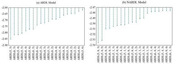 Figure 6 shows that the optimal specifications were an and a . These results imply that in order to empirically estimate Equation (6), it is necessary to use , instead of its lagged form in the long-term path of such an equation, as well as that the terms related to are omitted from the short-term path of the same equation. In this sense, I only tested the long-term null symmetry hypothesis in Equation (11).