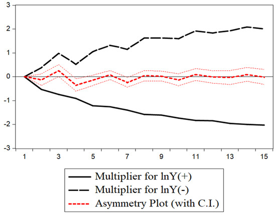 To complement the results in Table 8, the tourism GDP dynamic multiplier is presented in Figure 7. The figure shows that the asymmetry plot confidence interval contains the zero line in most of the periods, confirming that the null hypothesis of symmetry is not rejected; thus, these results are consistent with those in Table 8.
