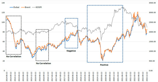 Crude oil prices and the Korean stock market index: 2014–2022.