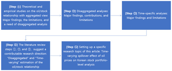 In order for a clearer presentation, we provide the steps of our literature review work in Figure 2. As the fundamental work, the first step is to review the theoretical background and channel for explaining the effect of oil prices on stock prices. The earliest empirical analyses with the theoretical results were mostly about aggregated estimation. Therefore, the first step of the review focuses on summarizing the major findings as well as the limitations of empirical studies by aggregated approaches. Then, for the second step, the focus of our review moves naturally to the disaggregated empirical analyses because the need for disaggregated analyses was brought by the limitations of the aggregated analysis in the first step. In addition to the empirical studies with disaggregated approaches, we reviewed the literature on the time-specific analyses for the third step because the need for specifying the time sample was emerging and growing too. Consequently, these steps of our literature review lead to a specific research topic that may contribute to the existing literature on the oil/price relationship, which is the time-varying spillover effect of oil prices on the Korean stock portfolio-level analysis.