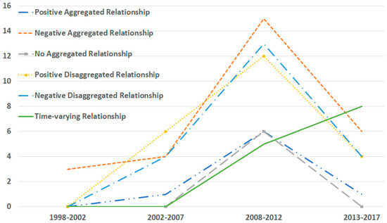 In addition to firm- or industry-specific analysis, time-specific analysis has been emerging in the oil/stock nexus. Especially since 2008, when the global financial crisis occurred, the number of publications dealing with the time-varying relationship has been growing persistently. As Figure 3 shows, according to Degiannakis et al. (2018), the number of papers finding time-varying relationships between oil and stock markets has been growing, although all other papers decreased after 2012. In particular, from 2013 to 2017, the number of articles that discovered the time-varying relationship was greater than the number of ones on all other topics. The time-varying relationship analysis mainly aims at identifying differences between the demand-side shock and the supply-side shock of oil markets. For example, Kang et al. (2015) identified that the oil shocks on the demand side of oil markets, such as the economic boom, exercised a positive effect during 1973–2012, whereas the oil shocks on the supply side of the oil market, such as oil supply capacity, have a negative effect during the early period, 1973–1980. Also, Antonakakis et al. (2013) examined whether the different oil price shocks have spillover effects on stock markets at different times. They found that the aggregate-demand shocks played a role as a net transmitter of shocks into stock markets during periods characterized by economic turbulence, while the supply-side and precautionary-demand shocks were net transmitters of shocks during geopolitical turbulence periods.