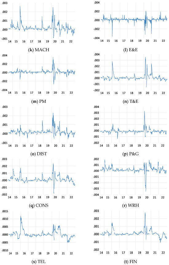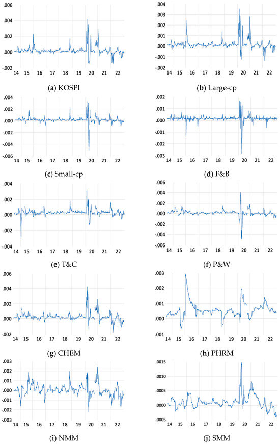 Secondly, in order to check whether the spillovers vary with time, this paper finds the time-varying conditional covariance between individual portfolio returns and Dubai oil prices from 2014 to 2022. As displayed in Figure 4, the covariance rose dramatically during the year 2020, in particular. The year 2020 was the time when COVID-19 broke out, and its threat was most serious, implying that the risk and uncertainty in international commodity and financial markets reached a peak during the recent decade. Among the portfolios, two energy-oriented portfolios, such as the power and gas portfolio and the chemical portfolio, had the greatest rise, which went over 0.03 during the year 2020. Therefore, it is concluded that the spillover effect from the international crude oil markets to the Korean stock market was the greatest in the year 2020 during the recent decade due to the greatest risk and uncertainty in the international commodity and financial markets, and the energy-oriented portfolios were the greatest over other portfolios. Thus, the sensitivity of the energy-oriented portfolio to the oil market risk reminds the investors in Korean energy industries why they should pay closer attention to the international oil markets.
