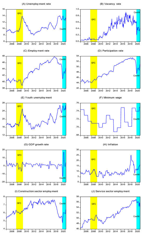 During the global financial crisis, the employment rate remained around 39 percent in 2009. Figure 1C,D indicate a steady increase in employment and labor force over time. In the second half of 2018, there was a slight decline in the employment rate from 47.9 percent to 47.4 percent. The outbreak of COVID-19 led to a decline in both the labor force and employment rate, primarily due to government restrictive policy measures. Between March and June 2020, the employment rate remained stagnant at around 41 percent. However, the labor force participation rate, shown in Figure 1D, exhibited a continuous upward trend until the pandemic hit, indicating that individuals were leaving the labor force due to crisis. Nevertheless, the government authority’s efforts to mitigate the impact of the pandemic on employment resulted in a slight improvement, with the employment rate rising to approximately 43 percent in July. This increase can be attributed to the gradual easing of lockdown measures and the resumption of economic activities.