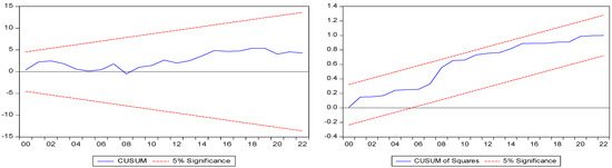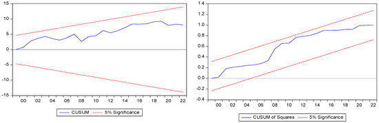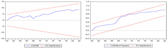 The cumulative sum (CUSUM) and the square of the cumulative sum (CUSUMSQ) tests serve as critical tools for assessing the short-term stability of the model. In essence, the CUSUM test analyzes the regression coefficients’ behavior, while the CUSUMSQ test evaluates the constancy of these coefficients (Brown et al. 1975).