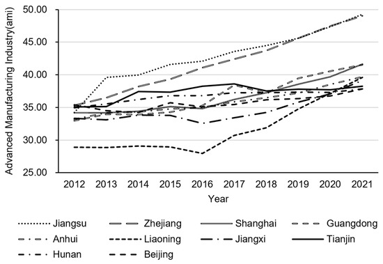 Based on the calculations, the top-ten provinces in China for advanced manufacturing in 2021 are Jiangsu Province, Zhejiang Province, Shanghai Municipality, Guangdong Province, Anhui Province, Liaoning Province, Jiangxi Province, Tianjin Municipality, Hunan Province, and Beijing Municipality. The development trends of advanced manufacturing in these provinces from 2012 to 2021 are illustrated in Figure 2.