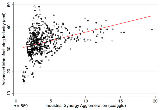 Figure 3 illustrates the scatter plot and fitted line depicting the relationship between industrial synergy agglomeration and the development of advanced manufacturing. The plot clearly demonstrates a positive correlation between the two variables, providing a solid foundation for the empirical research that follows.