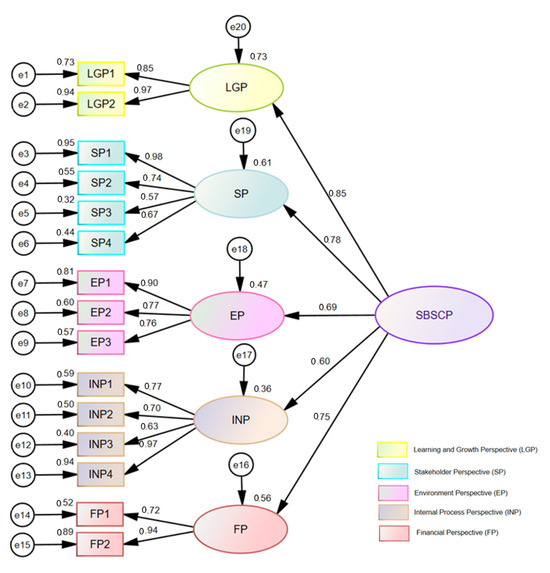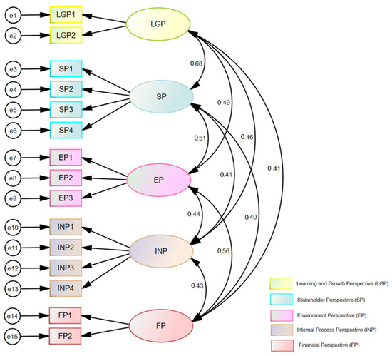 The use of CFA of the SBSCP confirmed the structural relationships of the observed variables with latent variables related to the learning and growth perspective (LGP1-LGP2), the stakeholder perspective (SP1-SP4), the environmental perspective (EP1-EP3), the internal process perspective (INP1-INP4) and the financial perspective (FP1-FP2). The results aligned with the empirical data, as shown in Figure 1. In addition, the test for model fit revealed two points: First, the absolute fit index, including CMIN/DF of 1.793 (where a value not exceeding three indicates a good fit), which showed that the model fits well with the statistical data. Moreover, other values such as an RMSEA of 0.045 (where a value not exceeding 0.05 indicates a good fit), a GFI of 0.985 (where a value not less than 0.95 indicates a good fit), an AGFI of 0.931 (where the value not less than 0.90 indicates a good fit) and an RMR of 0.017 (a value closer to 0 is preferred to indicate a good fit) showed that the absolute fit index was at a good level. Second, the incremental fit index, including an NFI of 0.987 (where a value not less than 0.95 indicates good fit), a TLI of 0.977 (where a value not less than 0.95 indicates good fit), a CFI of 0.994 and an IFI of 0.994 (where a value not less than 0.90 indicates good fit) showed that the model fits well with the statistical data. Even though the p-value for the Chi-square test was 0.000, it was considered to be statistically insignificant due to the fact that the Chi-square value is dependent on sample size. As the Chi-square value increases in a large sample size, it is deemed to be inappropriate for indicating model fit. Therefore, Bollen’s suggestion (Heebkhoksung et al. 2023) of examining a CMIN/DF less than three instead of the Chi-square value was used to test the model fit as shown in Table 3.